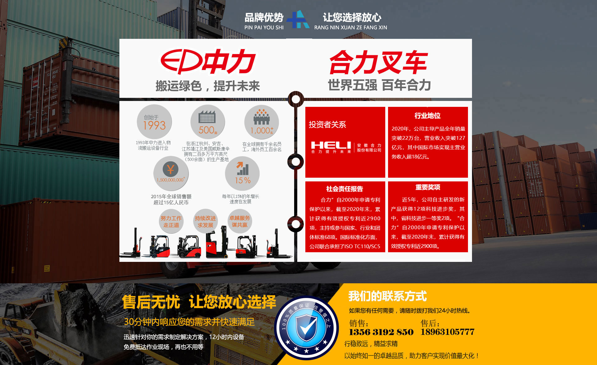 中力公司自1993年開(kāi)始進(jìn)入現(xiàn)代物流設(shè)備制造業(yè),是專業(yè)從事叉車及倉(cāng)儲(chǔ)設(shè)備的全球性制造企業(yè)。中力以產(chǎn)品技術(shù)創(chuàng)新,不斷滿足客戶定制要求而先于同行業(yè)。 榮獲德國(guó)紅點(diǎn)設(shè)計(jì)大獎(jiǎng)及美國(guó)、中國(guó)數(shù)百項(xiàng)專利,并因此得到了百事可樂(lè)、可口可樂(lè)、沃爾瑪、特斯拉、德邦等數(shù)百家全球500強(qiáng)企業(yè)及國(guó)內(nèi)物流龍頭企業(yè)的青睞。 ......